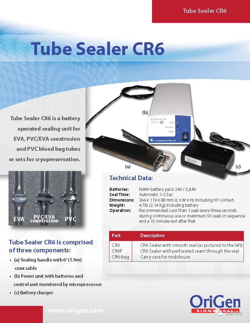 Biosealer CR6 冻存袋热合仪由三个单位组成:1.9米同轴电缆及密封手柄;带电池的电源单元;微型监控控制单元处理器。